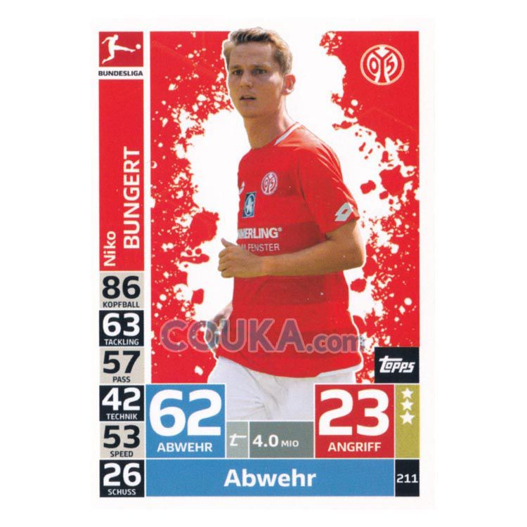 2018-2019 Topps German Fussball Bundesliga Match Attax Football Soccer Card #211 Niko Bungert Base FSV Mainz 05德甲球星卡 邦格特 普卡 美因茨