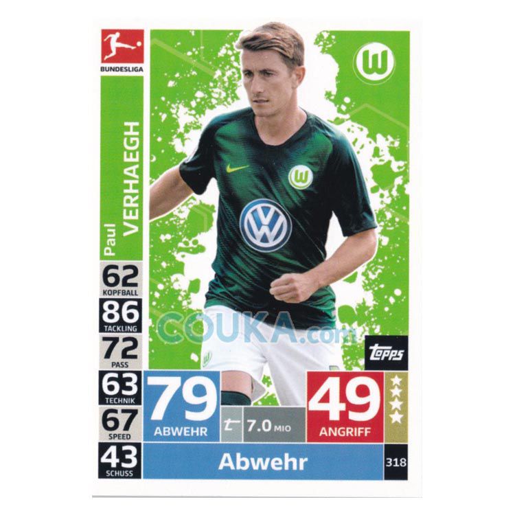 2018-2019 Topps German Fussball Bundesliga Match Attax Football Soccer Card #318 Paul Verhaegh Base VfL Wolfsburg德甲球星卡 费尔哈赫 普卡 沃尔夫斯堡