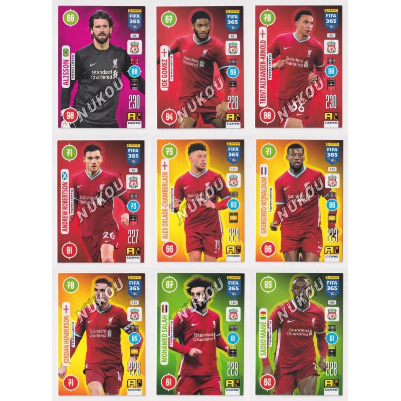 NUKOU寄售 2020-2021 Panini FIFA365 Adrenalyn XL Football Soccer Card BASE SET Liverpool 9 CARDS Alisson/Joe Gomez/Trent Alexander-Arnold/Andrew Robertson/Alex Oxlade-Chamberlain/Georginio Wijnaldum/Jordan Henderson/Mohamed Salah/Sadio Mane 帕尼尼FIFA365 常规版球星卡 游戏版 利物浦 9张 普卡 套卡 阿利松/乔 戈麦斯/阿诺德/安德鲁 罗伯逊/张伯伦/维纳尔杜姆/亨德森/萨拉赫/马内 发布相似商品