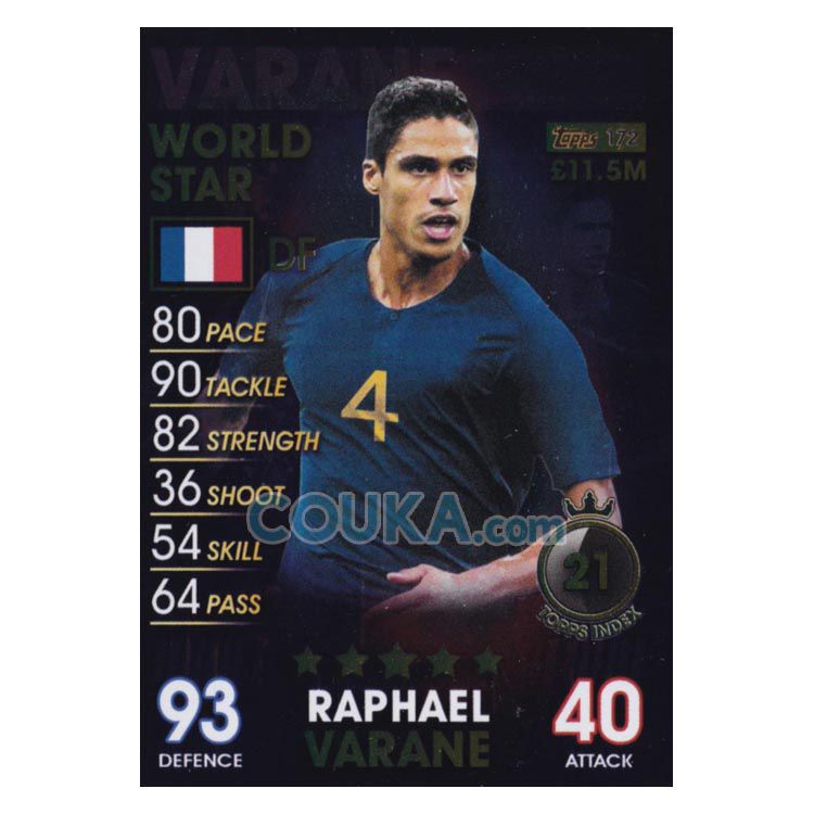 2018-2019 Topps Match Attax 101 Football Soccer Card #172 Raphael Varane World Stars France Topps101球星卡 瓦拉内 世界巨星 法国