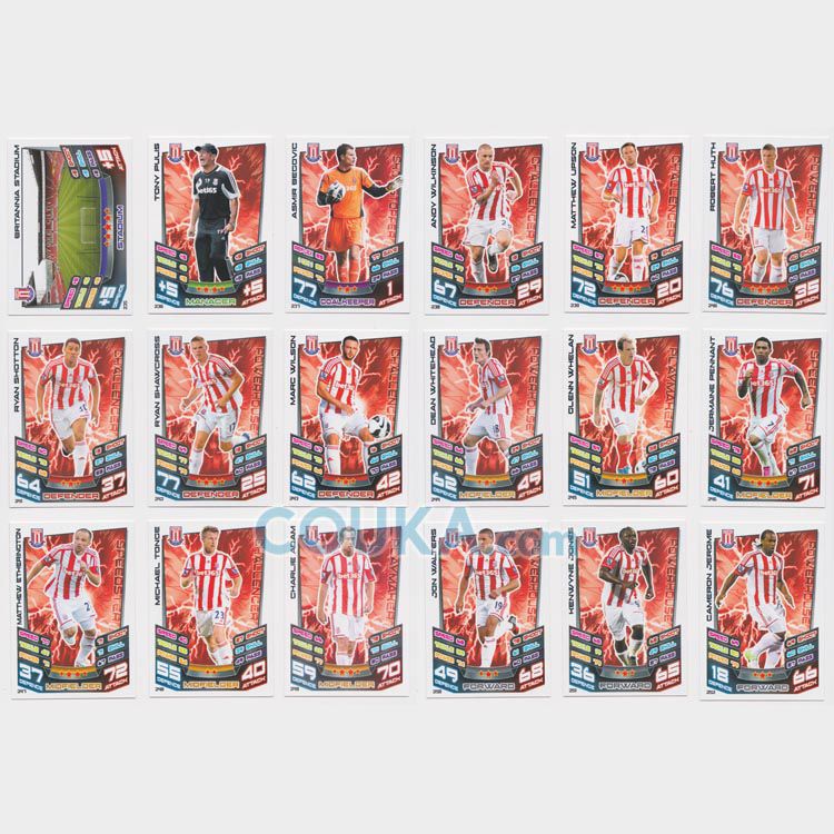 2012-2013 Topps EPL English Premier League Match Attax Football Soccer Card BASE SET Stoke City 18 CARDS Britannia Stadium/Tony Pulis/Asmir Begovic/Andy Wilkinson/Matthew Upson/Robert Huth/Ryan Shotton/Ryan Shawcross/Marc Wilson/Dean Whitehead/Glenn Whelan/Jermaine Pennant/Matthew Etherington/Michael Tonge/Charlie Adam/Jon Walters/Kenwyne Jones/Cameron Jerome英超球星卡 斯托克城 18张 球场/托尼 普利斯/阿斯米尔 贝戈维奇/安迪 威尔金森/马修 厄普森/罗伯特 胡特/R 肖顿/肖克罗斯/马科 威尔森/迪恩 怀特海德/格伦 惠兰/杰梅因 彭南特/马修 埃瑟林顿/迈克尔 汤吉/查理 亚当/沃尔特斯/肯温 琼斯/C 杰罗梅 发布相似商品