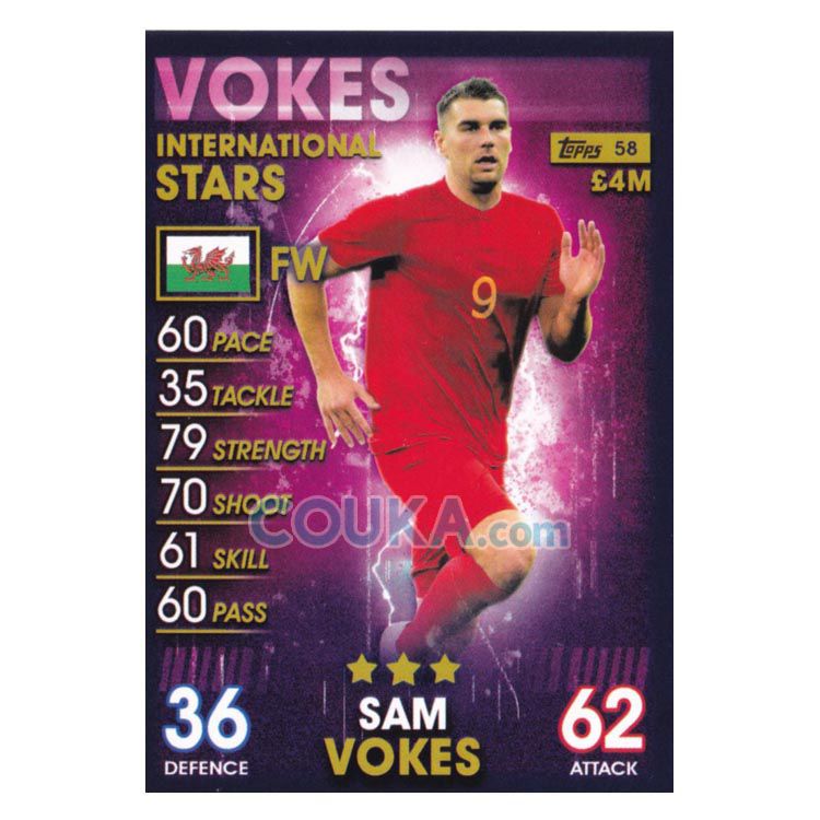 2018-2019 Topps Match Attax 101 Football Soccer Card #58 Sam Vokes International Star Wales Topps101球星卡 萨姆 沃克斯 国际巨星 威尔士