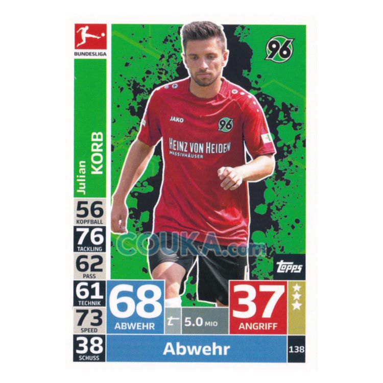 2018-2019 Topps German Fussball Bundesliga Match Attax Football Soccer Card #138 Julian Korb Base Hannover 96德甲球星卡 科布 普卡 汉诺威96