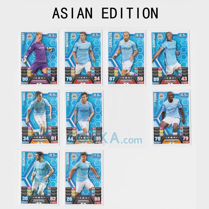 2013-2014 Topps EPL English Premier League Match Attax Asian edition Football Soccer Card BASE SET Manchester City 9 CARDS Joe Hart/Matija Nastasic/Pablo Zabaleta/Vincent Kompany/Jesus Navas/David Silva/Yaya Toure/Alvaro Negredo/Sergio Aguero英超 亚太版球星卡 曼城 9张 乔哈特/纳斯塔西奇/萨巴莱塔/孔帕尼/赫苏斯 纳瓦斯/席尔瓦/亚亚 图雷/阿尔瓦罗 内格雷多/阿奎罗 发布相似商品