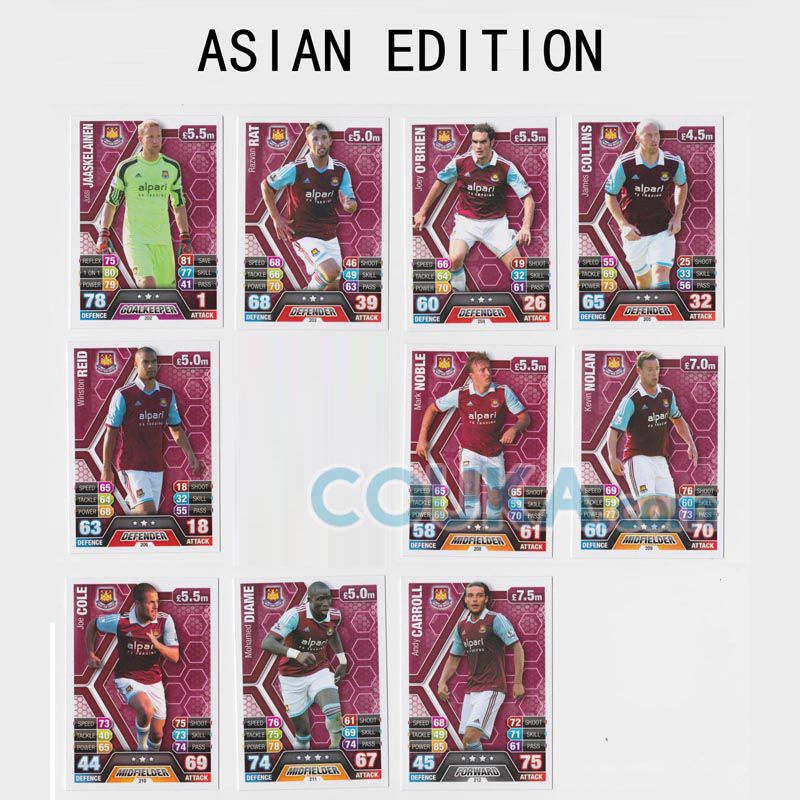 2013-2014 Topps EPL English Premier League Match Attax Asian edition Football Soccer Card BASE SET West Ham United 10 CARDS Jussi Jaaskelainen/Razvan Rat/Joey O'Brien/James Collins/Winston Reid/Mark Noble/Kevin Nolan/Joe Cole/Mohamed Diame/Andy Carroll英超 亚太版球星卡 西汉姆联 10张 雅斯科莱宁/拉兹万 拉特/乔伊 奥布莱恩/詹姆斯 科林斯/温斯顿 里德/诺布尔/凯文 诺兰/乔科尔/穆罕默德 迪亚梅/安迪 卡罗尔 发布相似商品
