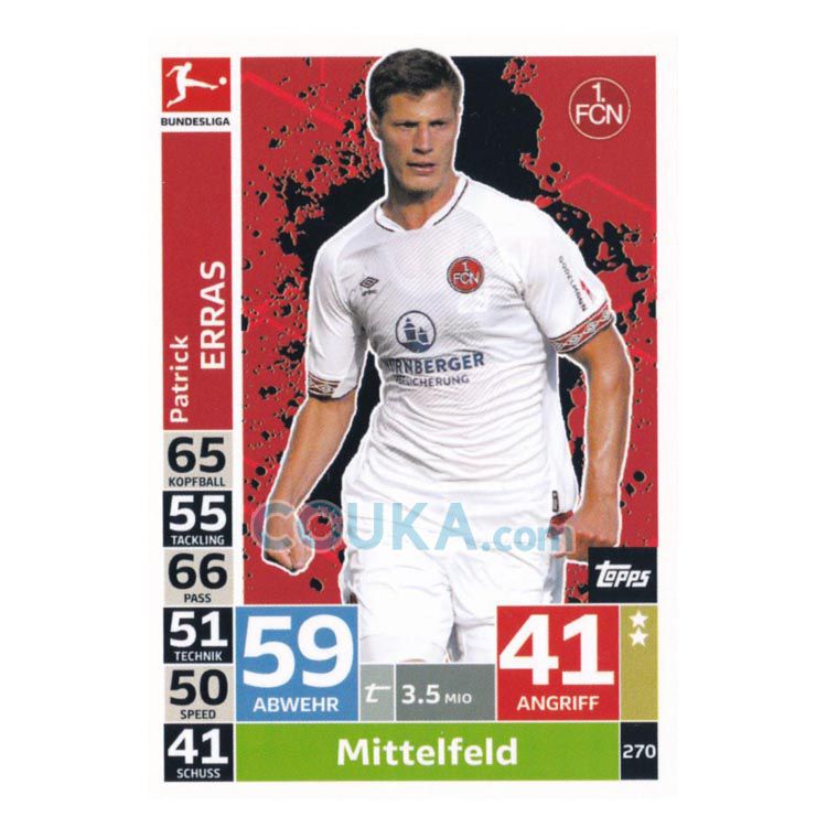 2018-2019 Topps German Fussball Bundesliga Match Attax Football Soccer Card #270 Patrick Erras Base Nurnberg德甲球星卡 埃拉斯 普卡 纽伦堡