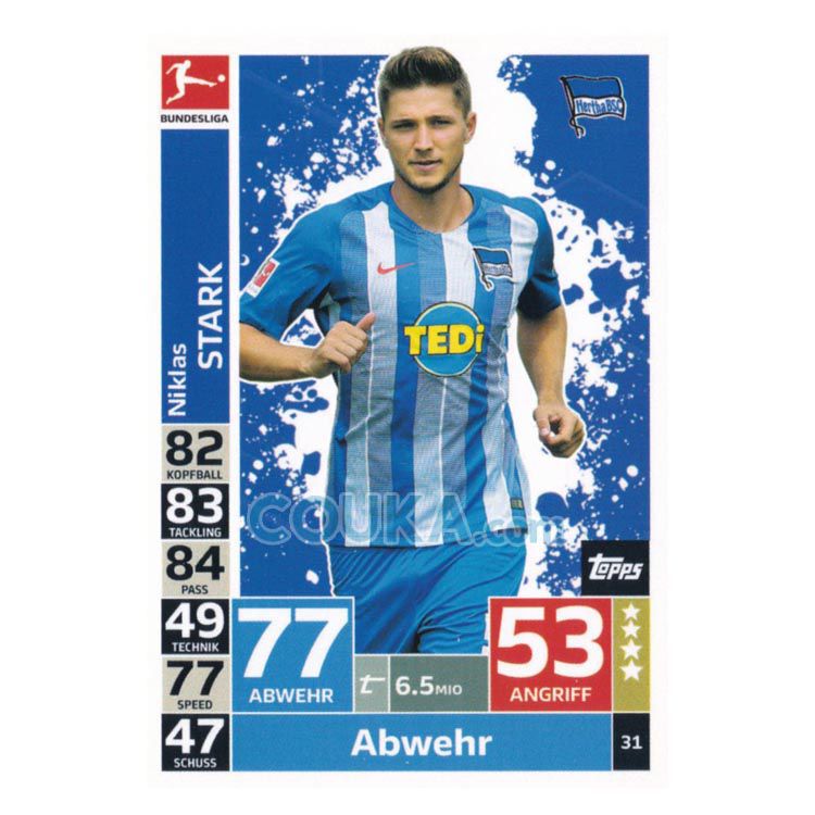 2018-2019 Topps German Fussball Bundesliga Match Attax Football Soccer Card #31 Niklas Stark Base Hertha Berlin德甲球星卡 施塔克 普卡 柏林赫塔