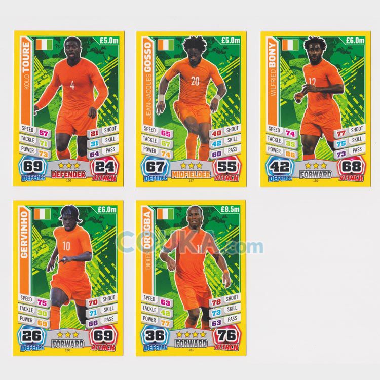 2014 Topps FIFA World Cup England Match Attax Football Soccer Card BASE SET Ivory Coast 5 CARDS Kolo Toure/Jean-Jacques Gosso/Wilfried Bony/Kouassi Gervinho/Didier Drogba Topps世界杯 英国版球星卡 科特迪瓦 5张 科洛 图雷/让-雅克 戈索/博尼/热尔维尼奥/德罗巴 发布相似商品