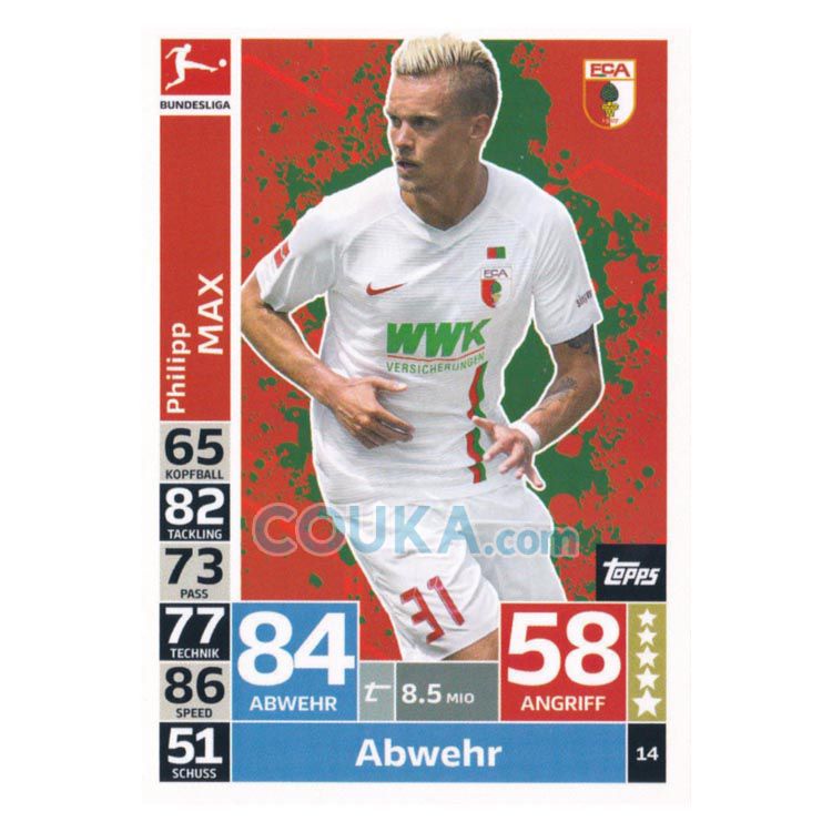 2018-2019 Topps German Fussball Bundesliga Match Attax Football Soccer Card #14 Philipp Max Base Augsburg德甲球星卡 菲利普 马克斯 普卡 奥格斯堡